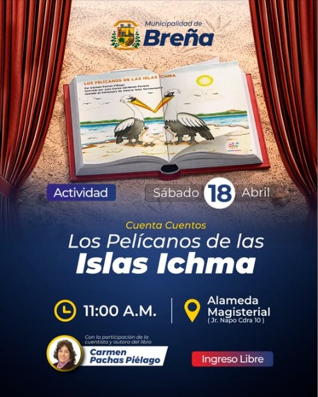 En el marco de las actividades organizadas por la Municipalidad de Breña con motivo del Día del Niño Peruano 2026, Carmen Pachas Piélago, presidenta de Yachaypucllaypacha, narrará su cuento «Los pelícanos de las islas ichma», inspirada en el friso con los dos pelicanos «besándose» encontrado en la Pirámide B del complejo arqueológcio Mateo Salado en 1962.